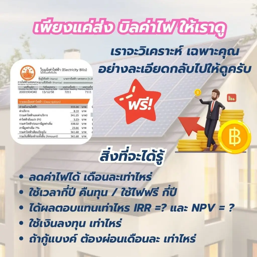 - ในปัจจุบันค่าไฟของบ้านที่อยู่อาศัย อยู่ในอัตราราคา 5 บาท และมีแนวโน้มจะสูงขึ้นเรื่อยๆ เพราะกระแสรถ EV ก็เป็นตัวเร่งให้การใช้ไฟเพิ่มขึ้น โซล่าเซลล์ จึงเป็นทางแก้ปัญหานี้